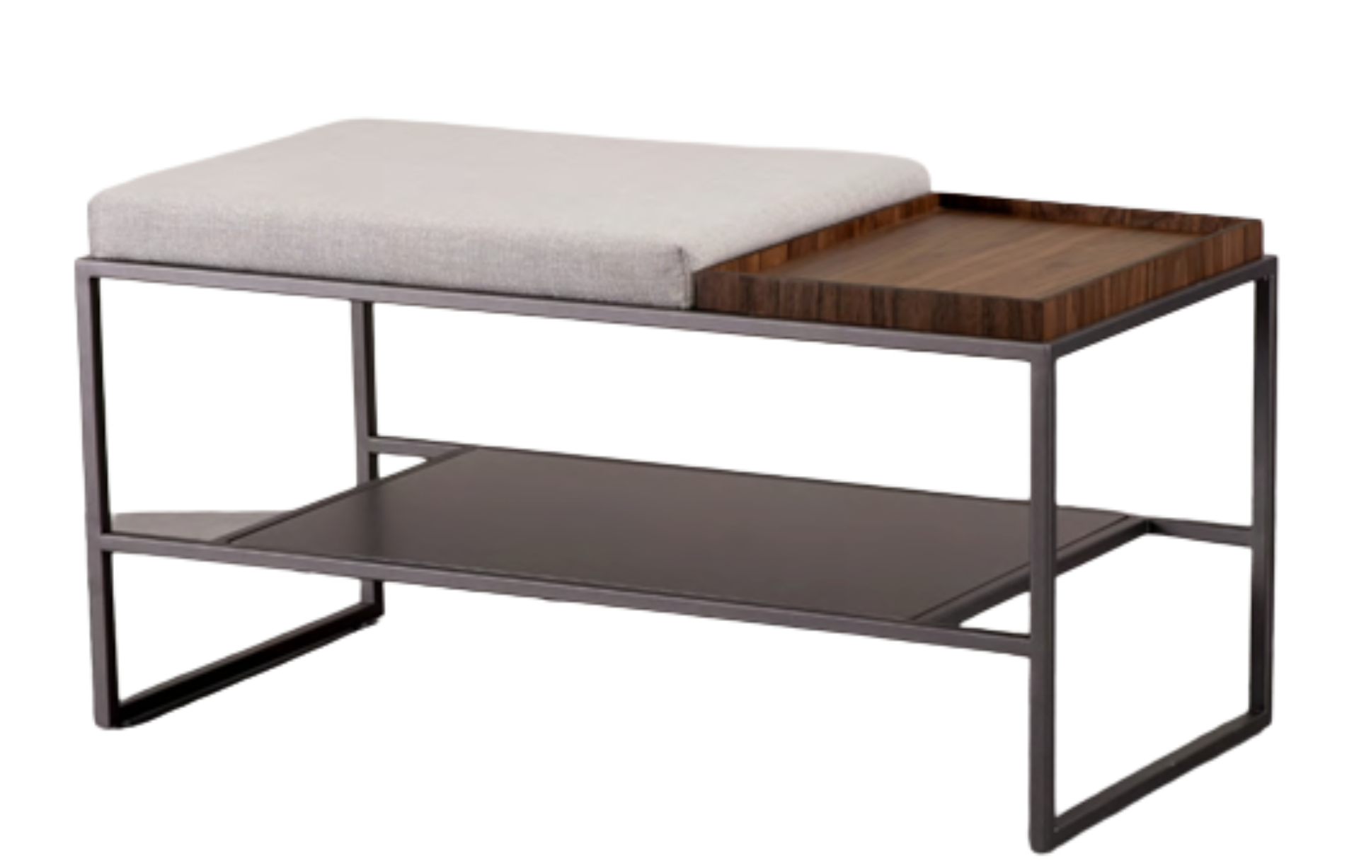 Banco Tricarico com design funcional com assento estofado, bandeja laminada e sapateira laqueada no mesmo tom da estrutura em aço carbono pintado.
