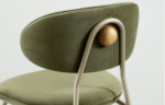Banqueta Calama com assento e encosto estofados, estrutura em aço carbono pintado e detalhe em madeira natural no encosto.