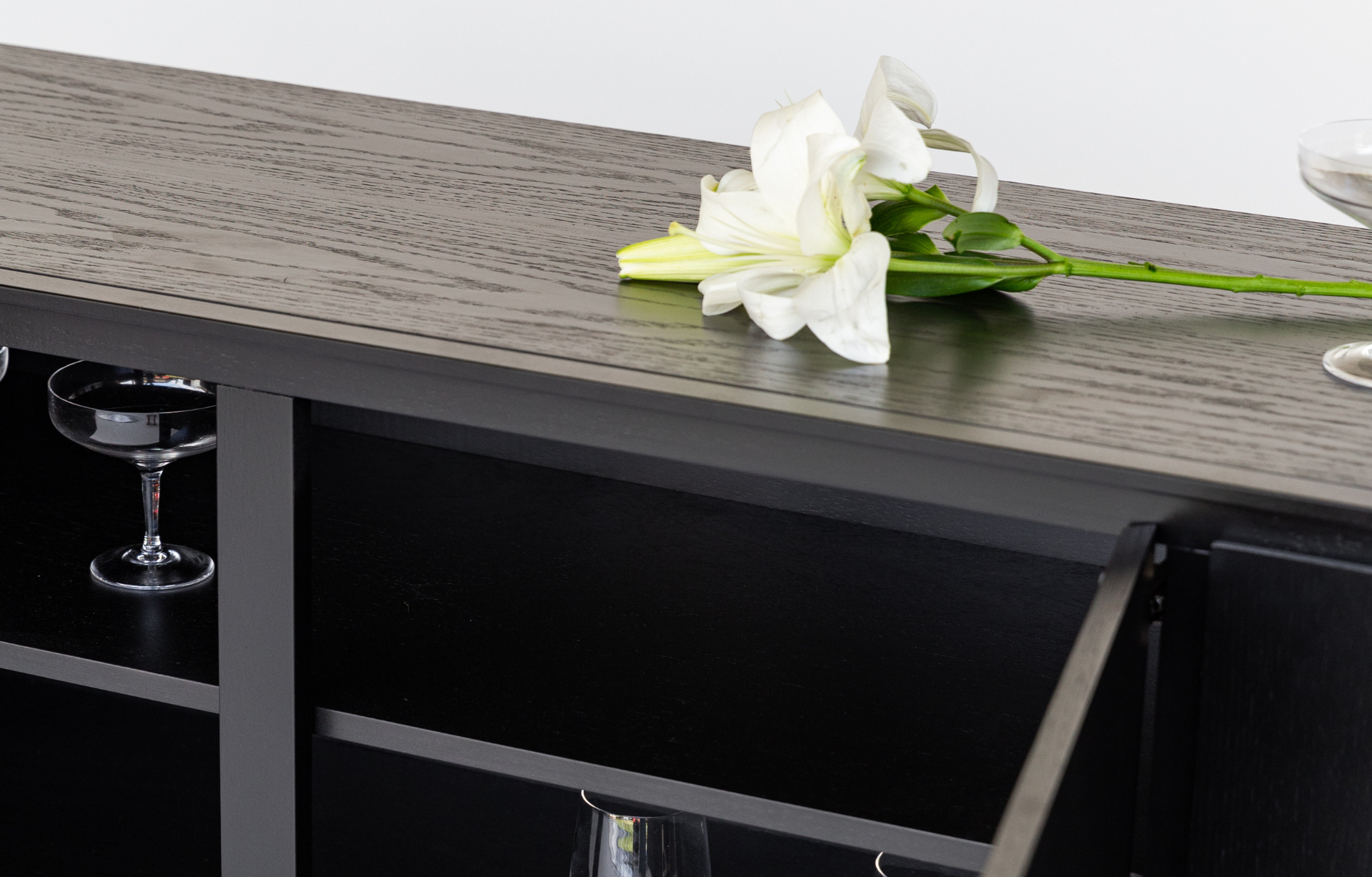 Buffet/Rack Cocal com estrutura em madeira maciça, possui quatro portas e duas gavetas, oferecendo amplo espaço de armazenamento. Seu design minimalista e as pernas de metal alongadas conferem uma estética contemporânea, ideal para salas de jantar ou estar.