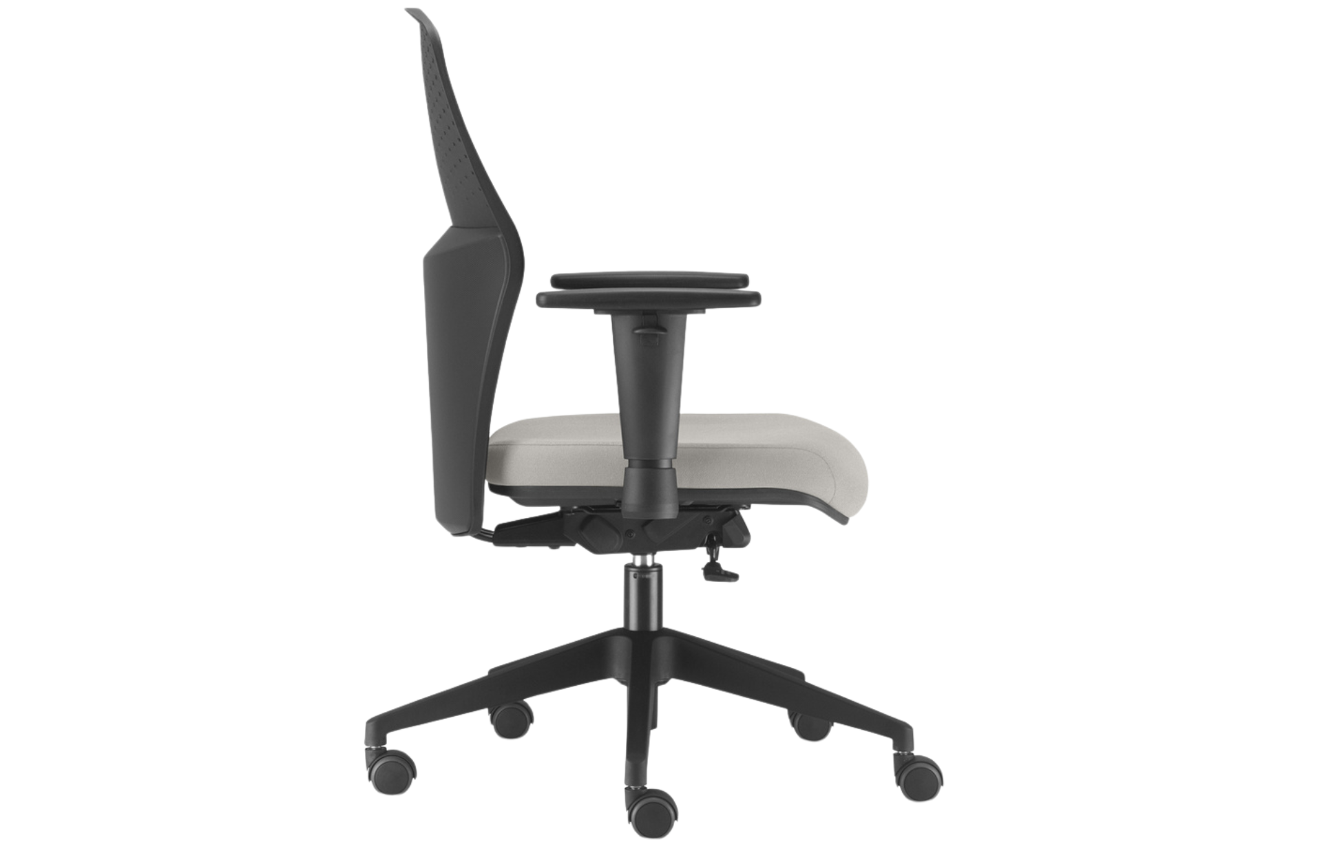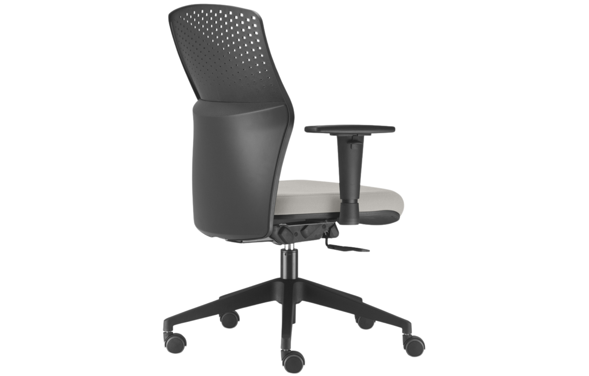 Encosto em polímero injetado, em diversas cores, com regulagem de altura, este encosto possui pequenos respiradores circulares permeando o espaldar, atende a um design único e permite a perspiração do usuário, possuí uma curvatura lombar que permite maior conforto.