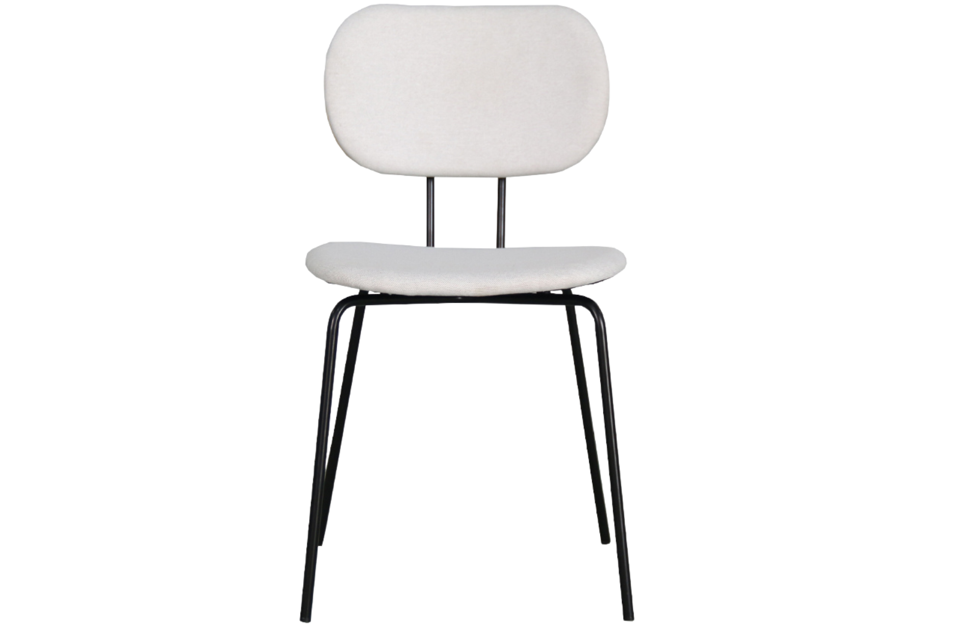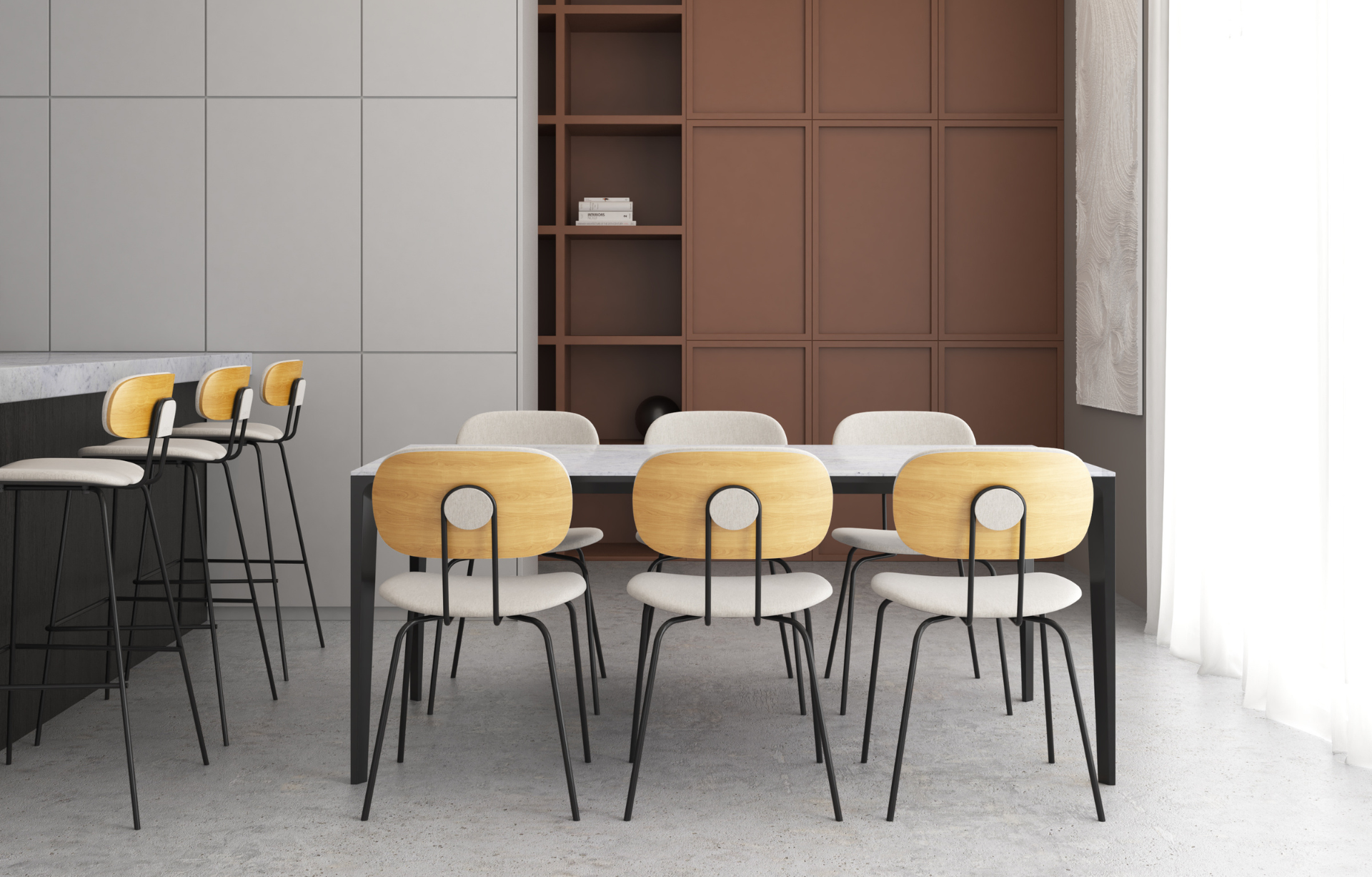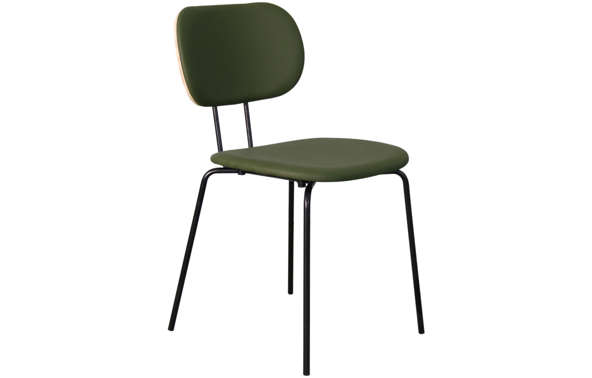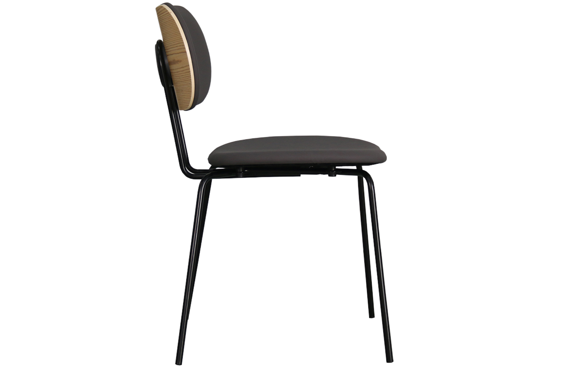 Cadeira Boogie estofada em PU, com encosto em madeira e detalhe em PP. Base pintada em aço pintado a pó.