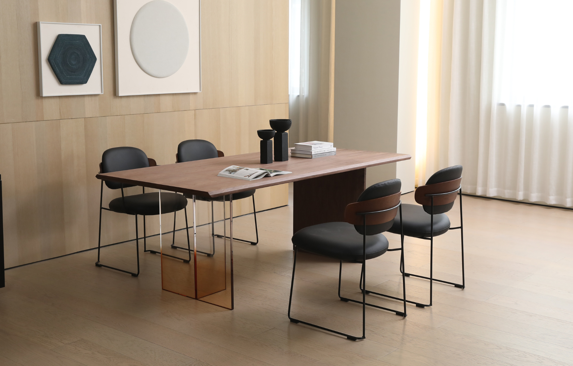 Cadeira Downtown, estofada em poliuretano ou tecido com detalhe de madeira multilaminada no encosto. Base em aço pintado à pó.