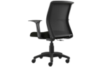 Assento em espuma injetada revestido em tecido a definir, com braços fixos, mecanismo que permite a regulagem de altura da cadeira e o giro no eixo, sua base e rodízios são em nylon.