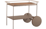 Carro bar Oster com bandeja superior com borda em pintura laca e fundo em recouro. Tampo inferior em pintura laca. Estrutura em aço carbono pintado com rodas detalhes da roda em recouro no mesmo padrão da bandeja superior.