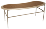 Escrivaninha Mix com tampo orgânico e bordas chanfradas para maior ergonomia. Opção de borda laminada ou pintura laca, com fundo em recouro. Estrutura em aço carbono pintado com ponteiras em latão.