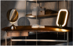 Espelho Saturna redondo com moldura revestida em lâmina de madeira natural, trazendo sofisticação para qualquer ambiente.