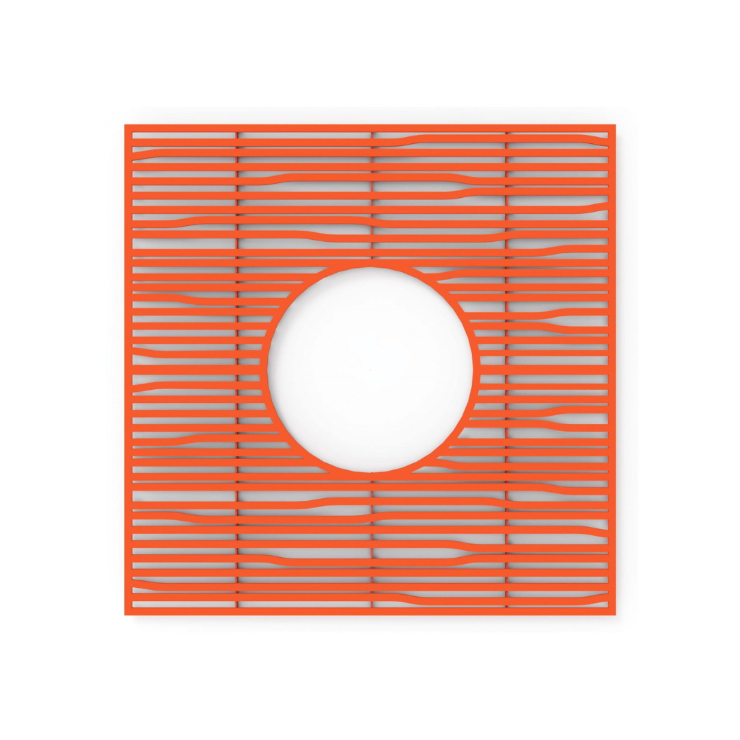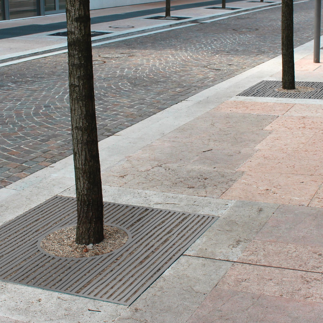 Grade para árvore em chapa de aço galvanizada e pintada a pó decorada e conformada com reforços. Disponível em três tamanhos (P, M e G), e diversas cores. Para cada versão, você pode solicitar a respectiva contra-estrutura em aço.