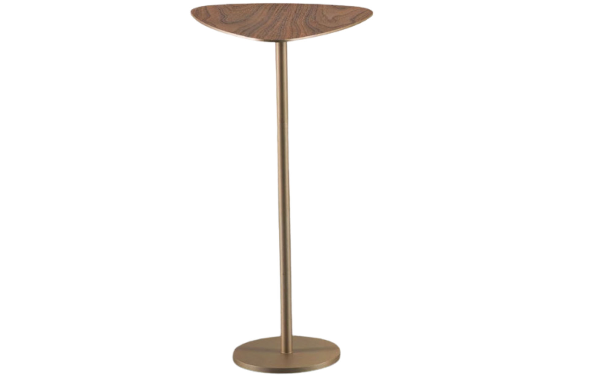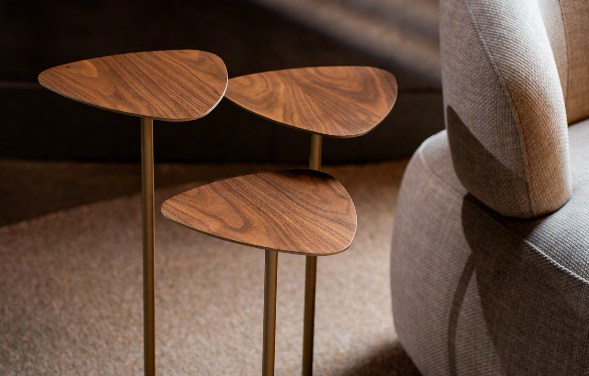 Mesa de Apoio Bahia com Tampo revestido em Lâmina de Madeira Natural ou Recouro e base em aço carbono pintado, combinando elegância e durabilidade.