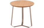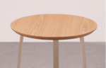 Mesa de Apoio Gerona com tampo redondo em lâmina de madeira natural e estrutura em aço carbono cortado a laser, destacando precisão e elegância no design.