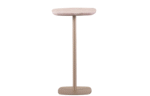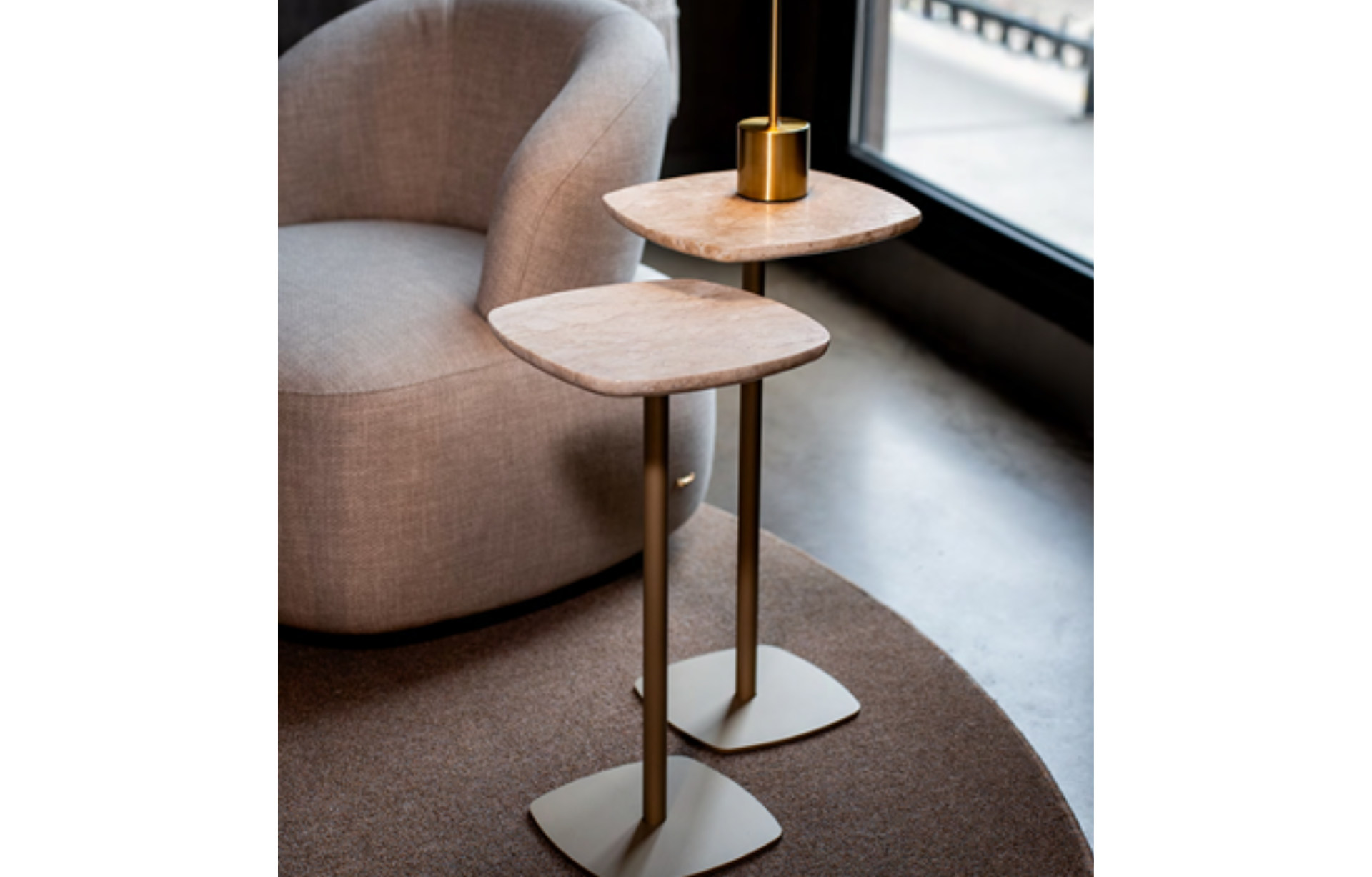 Mesa de Apoio Lucia com tampo em MDF laminado, recouro ou mármore travertino. Estrutura em aço carbono pintado.