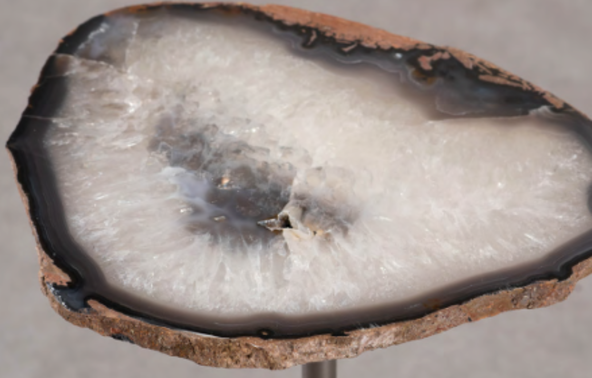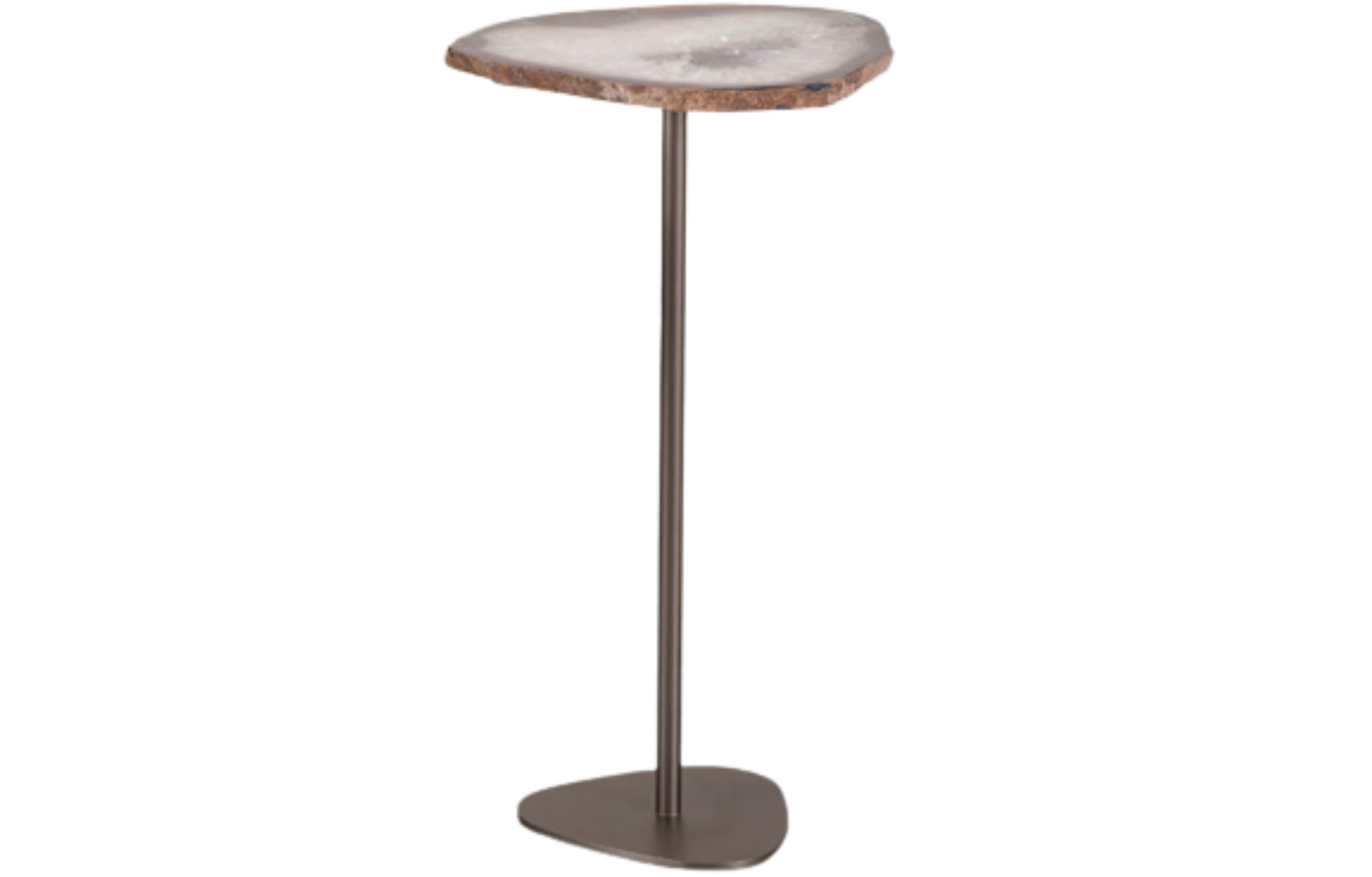 Mesa de Apoio Uranus com tampo em pedra natural Ágata, com estrutura em aço carbono pintado. Tamanho do tampo pode variar de 27 a 34cm, com formato orgânico ou arredondado. As cores variam conforme a disponibilidade. Espessura aproximada de 2cm.