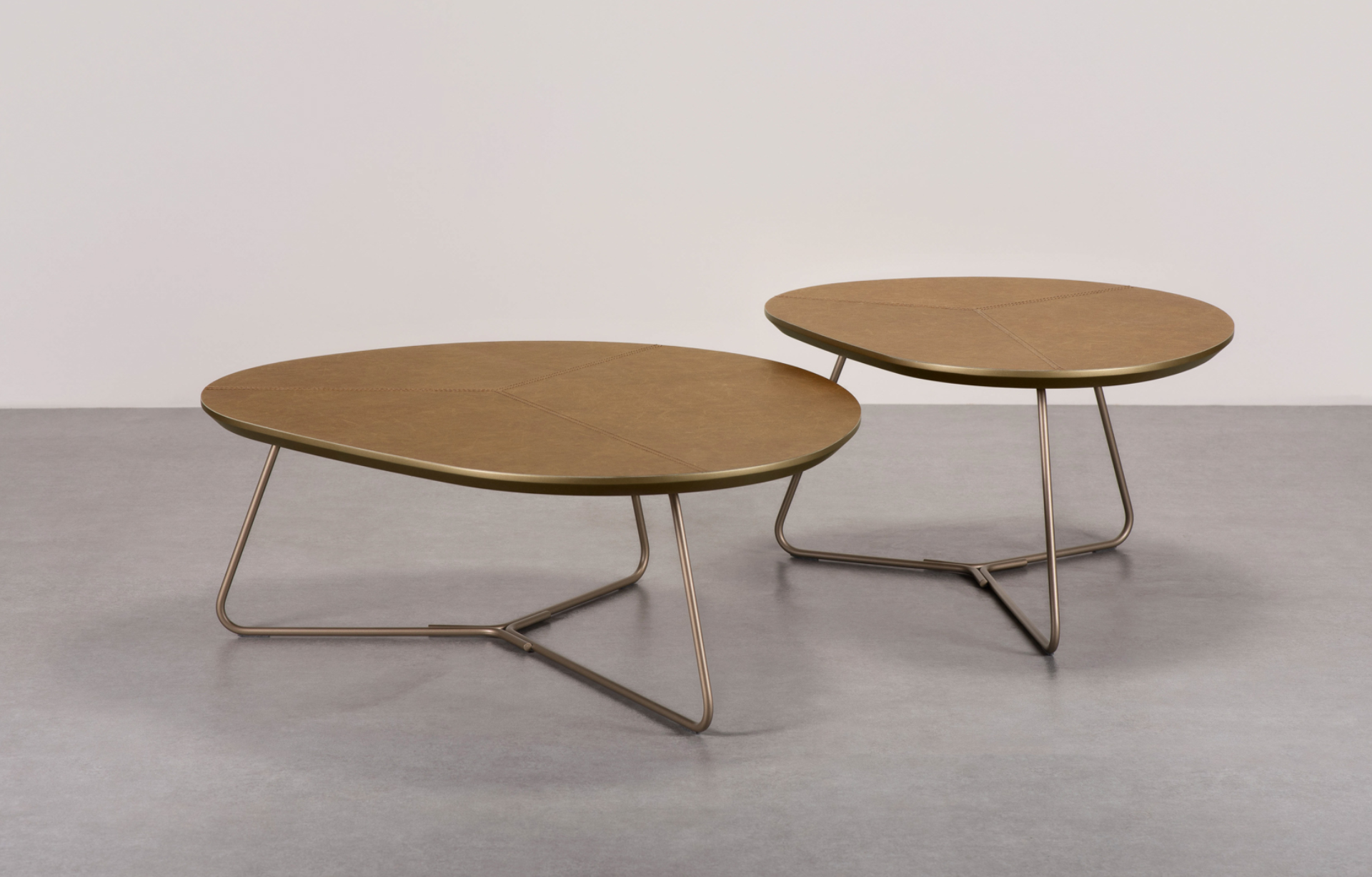 Mesa de Centro Fit com tampo em formato orgânico, disponível em lâmina de madeira natural ou recouro. Estrutura em aço carbono pintado.