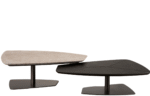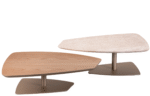 Mesa de Centro Megan com tampo em formato orgânico, disponível em recouro, lâmina de madeira natural ou mármore travertino. Base em aço carbono pintado.