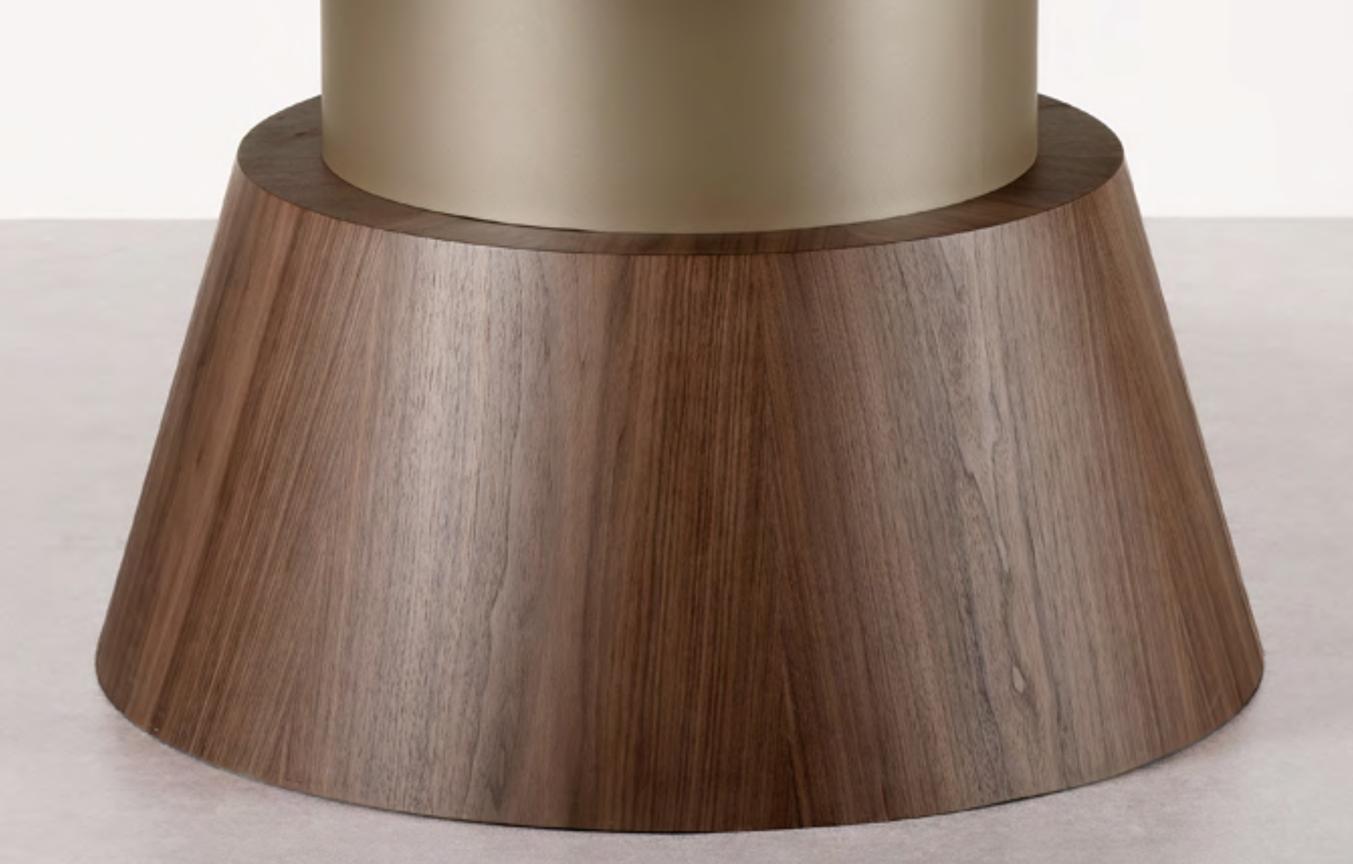 Mesa de Jantar Gam redonda com tampo em BP, laminado ou vidro pintado. Base em acabamento laminado ou laca. Base superior (liga o tampo a base) sempre em laca.