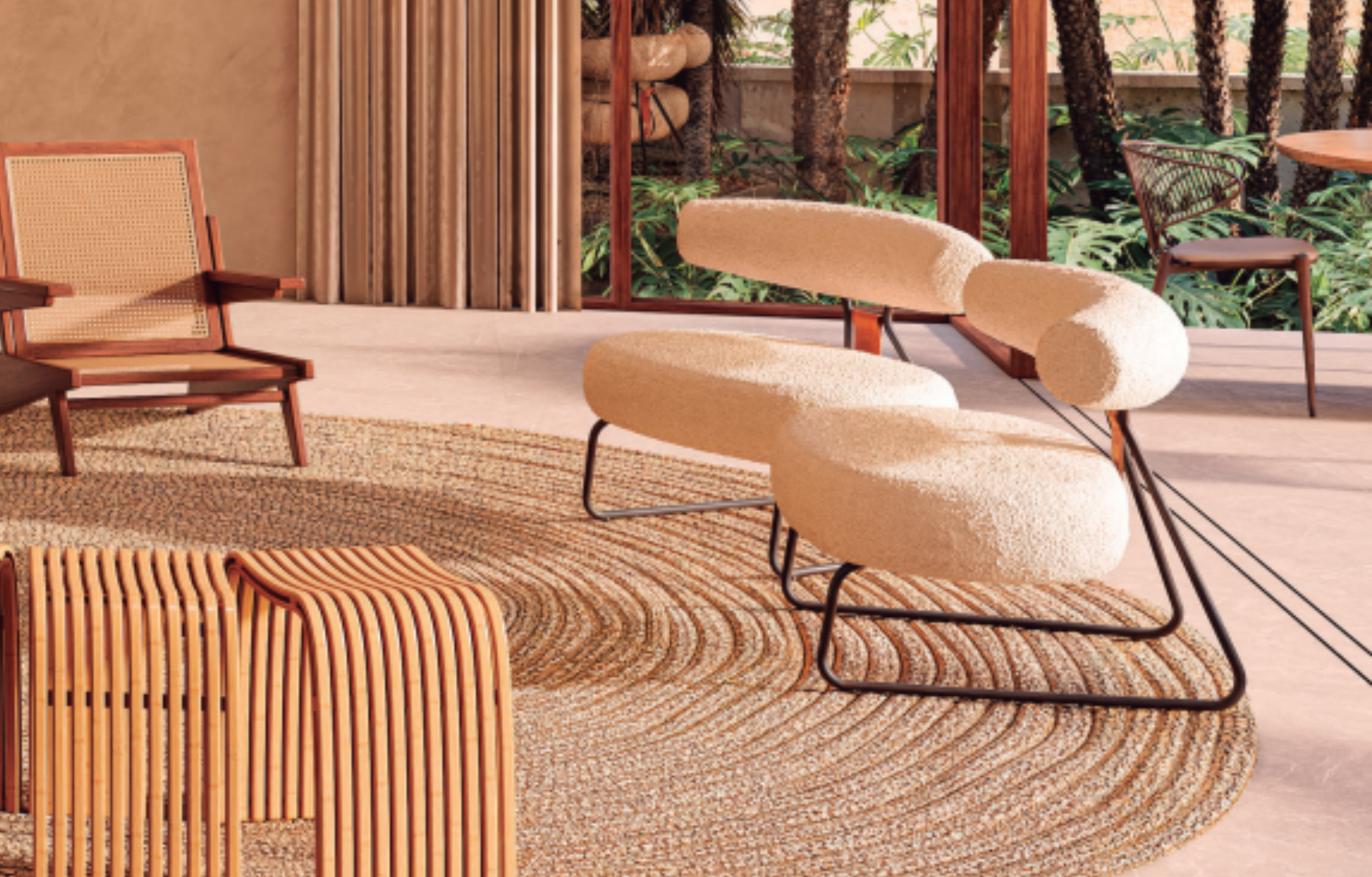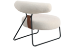 Poltrona Aoty estofada em tecido com estrutura em Aço Pintado à Pó e conexão do encosto em Couro.