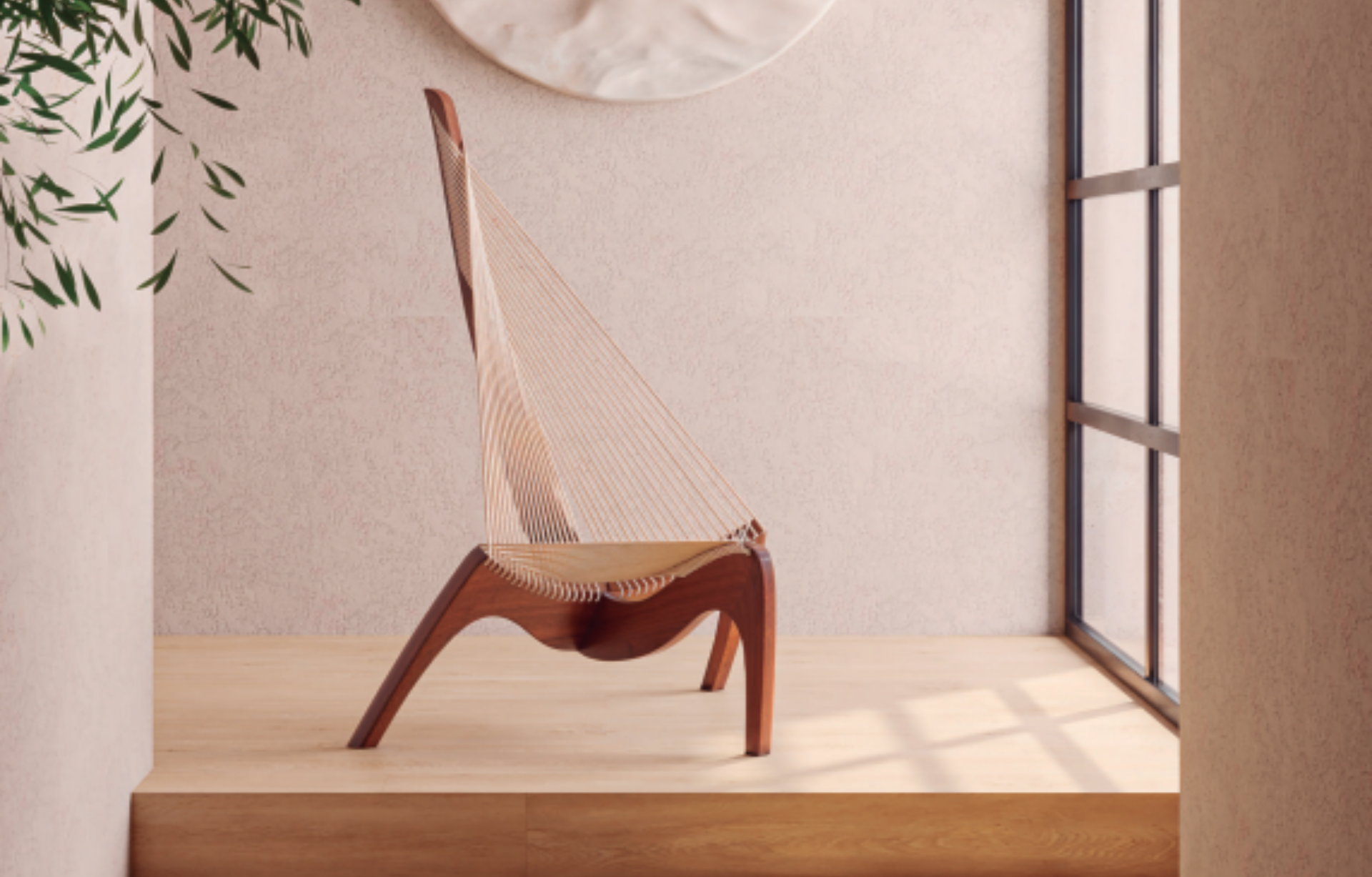 Poltrona Vela em madeira com cordas tramadas.