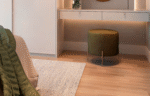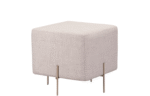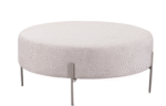 Puff Gold estofado com pés em aço carbono pintado e espuma D26, disponível nas versões redonda, quadrada e retangular.