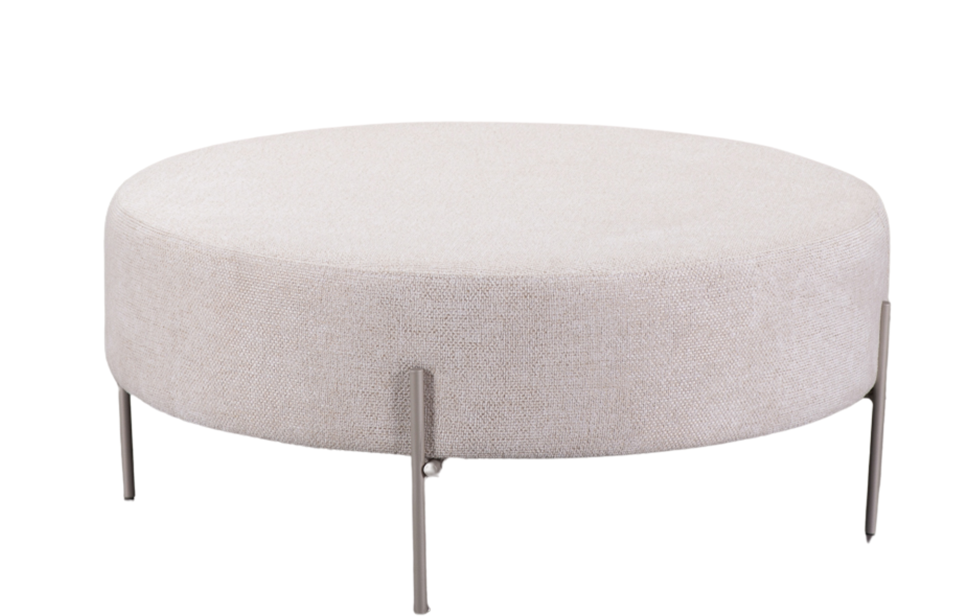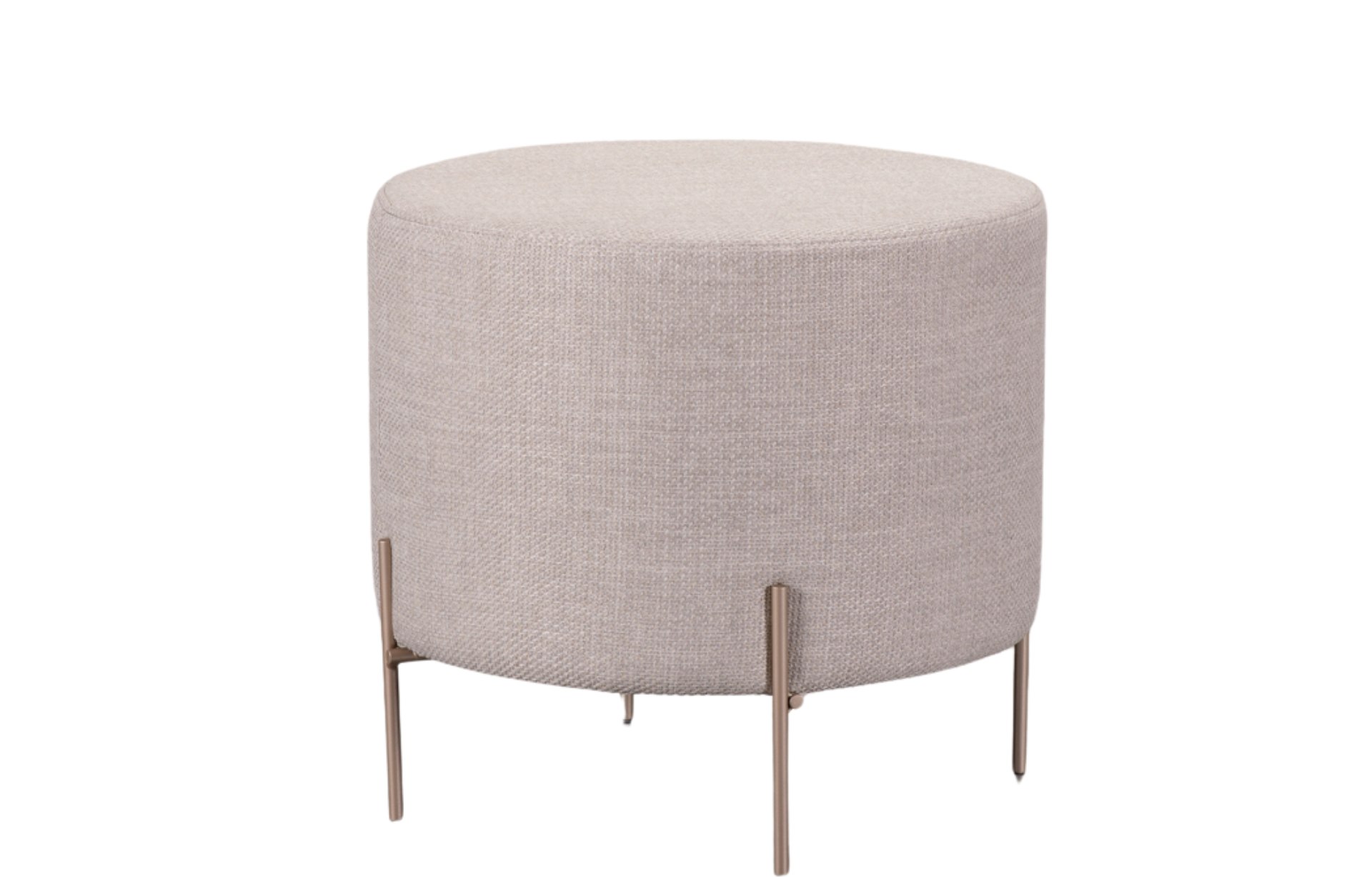 Puff Gold estofado com pés em aço carbono pintado e espuma D26, disponível nas versões redonda, quadrada e retangular.